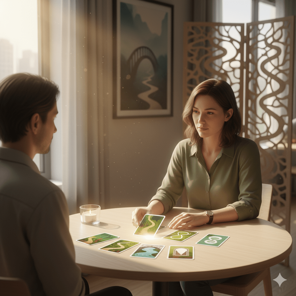 A thoughtful adult sitting at a table with OH Cards, soft sunlight streaming in, counsellor guiding the session, cards showing abstract symbols like paths, bridges, doors, reflective and calm mood, professional but slightly mystical, modern Singaporean interior, warm color tones (soft browns, greens, gold), contemplative expression, subtle artistic glow highlighting the cards. Visualize cards laid out in a semi-circle, with client reaching for one card intuitively. Add soft visual metaphors of paths or bridges subtly in the background.