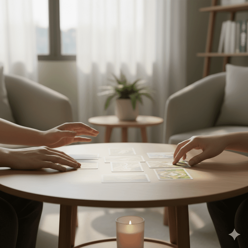 A serene counselling room with soft natural light filtering through a window, a professional counsellor sitting across from an adult client at a table, an OH Cards deck spread between them, warm and reflective atmosphere, subtle mystical glow on the cards, realistic yet gentle photography style, neutral Singaporean interior design, calming color palette (soft beige, green, and gold), emotional, contemplative mood. Focus on a close-up of hands selecting OH Cards with blurred background of the counselling space. Add a subtle reflective surface or soft candlelight to create a mystical, introspective vibe.