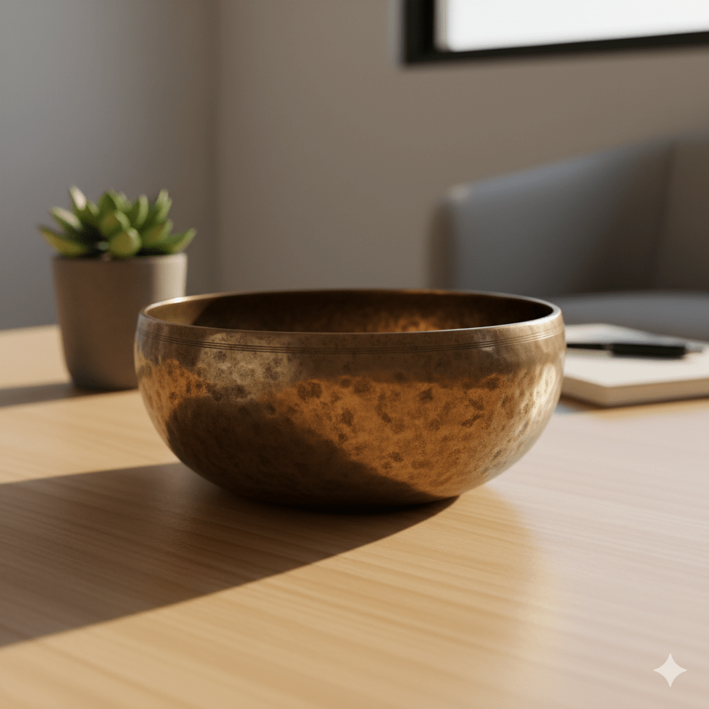 Close-up of a handcrafted Nepalese moon bowl with visible hammer marks, photographed under soft warm light, on a counselling table in Singapore. Peaceful, professional, reflective atmosphere.