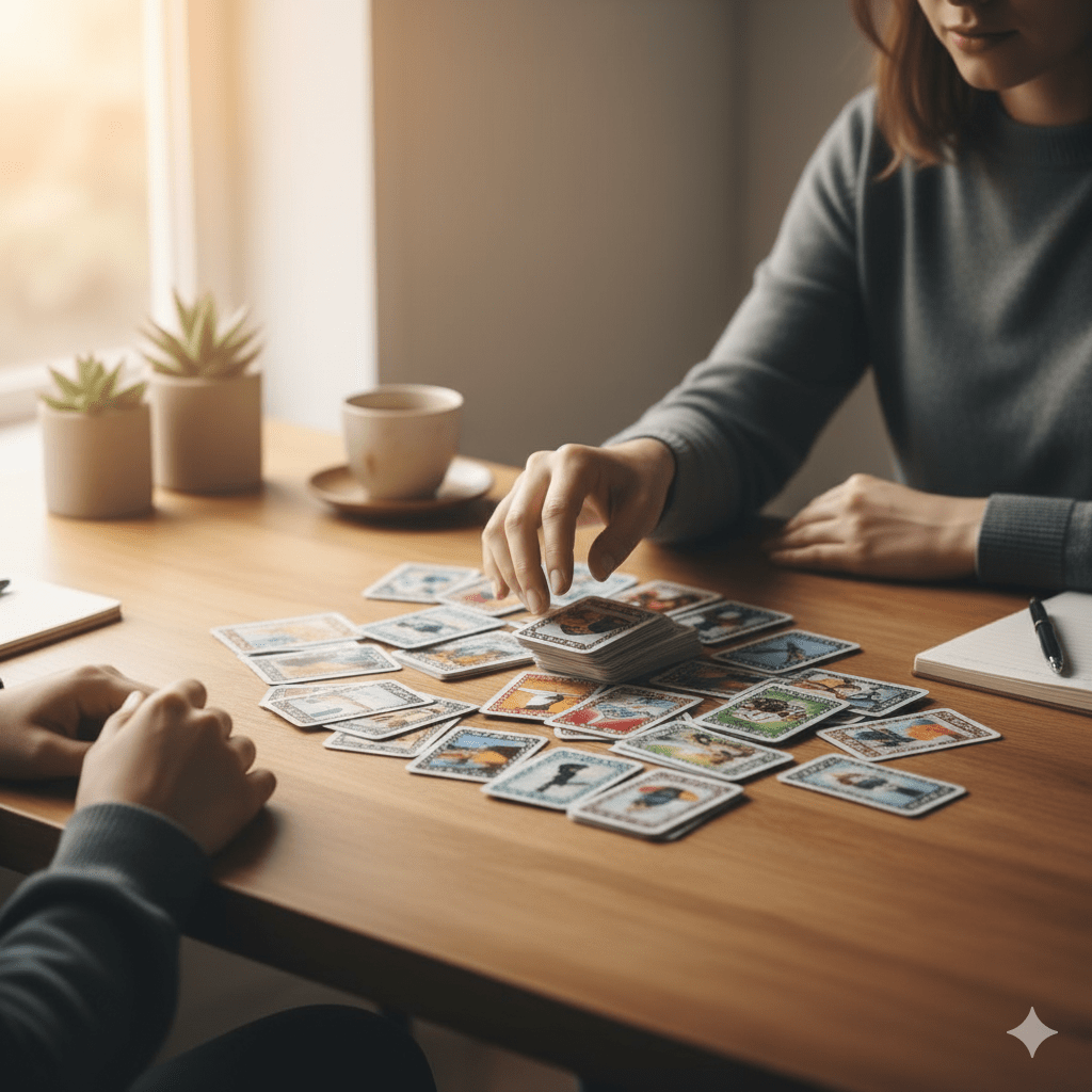 Counsellor and client with OH Cards on a table, soft lighting Close-up of hands selecting a card Reflective, warm environment with minimal props