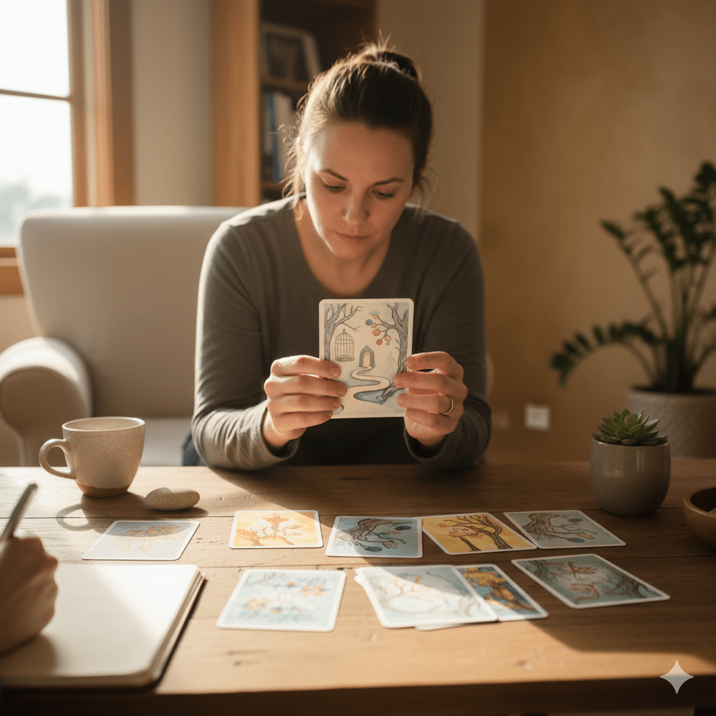 Person sitting at a table with OH Cards spread before them, soft natural light Close-up of hands holding a card with reflective expression Calm indoor environment with warm tones, minimal distractions