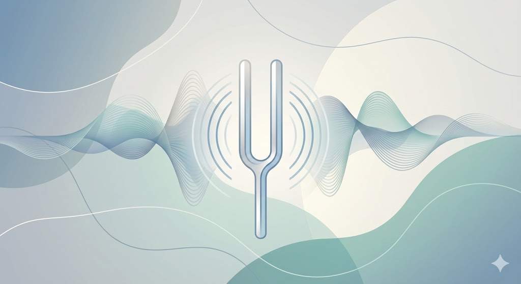 Create a calming, professional wellness-themed illustration featuring soft lighting, gentle gradients, and a serene atmosphere. Include a tuning fork or sound-wave motif to represent sound healing, shown in an abstract, minimalist style. The composition should feel modern and therapeutic, suitable for a mental health counselling centre’s blog. Use neutral and cool tones, with a sense of clarity, balance, and emotional grounding. No people. High resolution