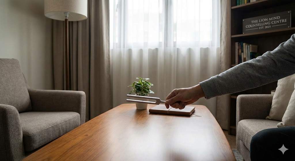 A soft, calm therapeutic scene in a Singapore counselling room (within The Lion Mind Counselling Centre). A 40-year-old Singaporean Chinese Male counsellor’s hand is holding a metal tuning fork above a wooden therapy table, with gentle light falling across the room. The atmosphere should be warm, reflective and professional.