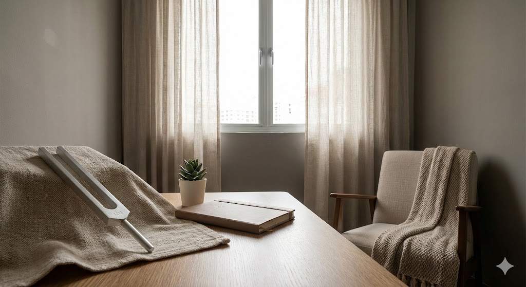 A calm counselling room in Singapore with soft natural lighting, neutral colours, and a minimalistic aesthetic. A tuning fork rests on a cloth-covered surface beside a notebook and a small plant. The atmosphere feels professional, warm, and grounded. No mystical symbols. High-resolution, photorealistic, reflective mood, suitable for a mental health blog.