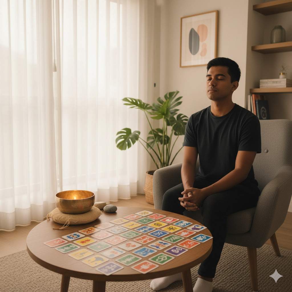 A tranquil counselling space in Singapore with warm natural light. An adult sits reflectively with OH Cards spread on a wooden table and a softly glowing Moon Bowl nearby. The focus is on mindfulness, emotional clarity, and healing, not fortune-telling. Modern, approachable, warm tones.
